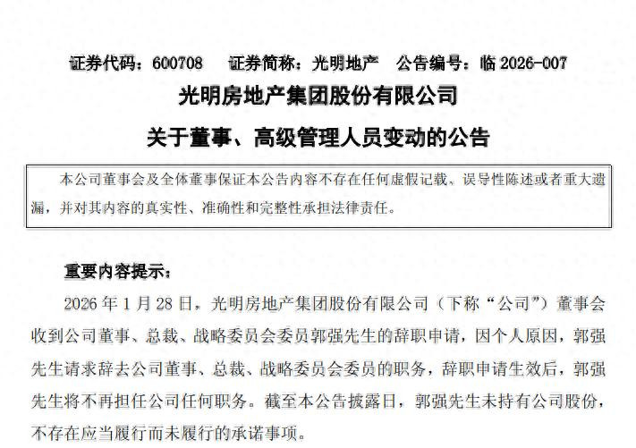 近日,光明地产(600708.SH)发布公告,因个人原因,郭强请求辞去公司董事、总裁、战略委员会委员的职务,辞职申请生效后,郭强将不再担任公司任何职务。