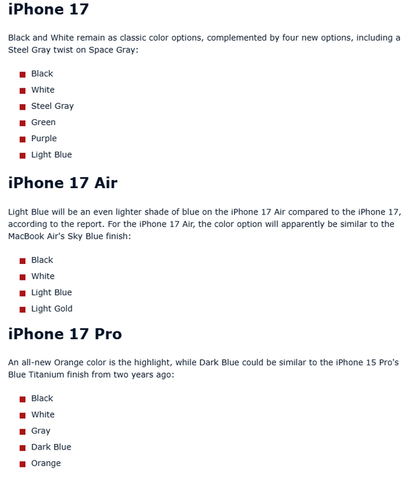 [CNMO科技消息]据海外媒体报道,一份据称为苹果内部文件的资料完整披露了即将发布的iPhone17系列四款机型——iPhone17、iPhone17Air、iPhone17Pro和iPhone17ProMax的全部配色方案。该系列机型预计将在9月发布。